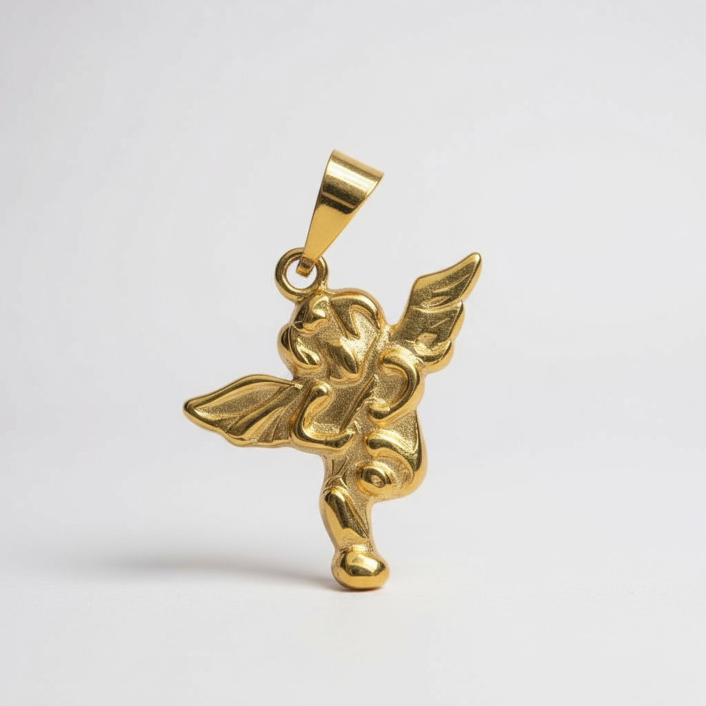 Das Design zeigt einen liebevoll gestalteten Engel, gefertigt aus hochwertigem, vergoldetem Edelstahl – zeitlos, elegant und voller Bedeutung.