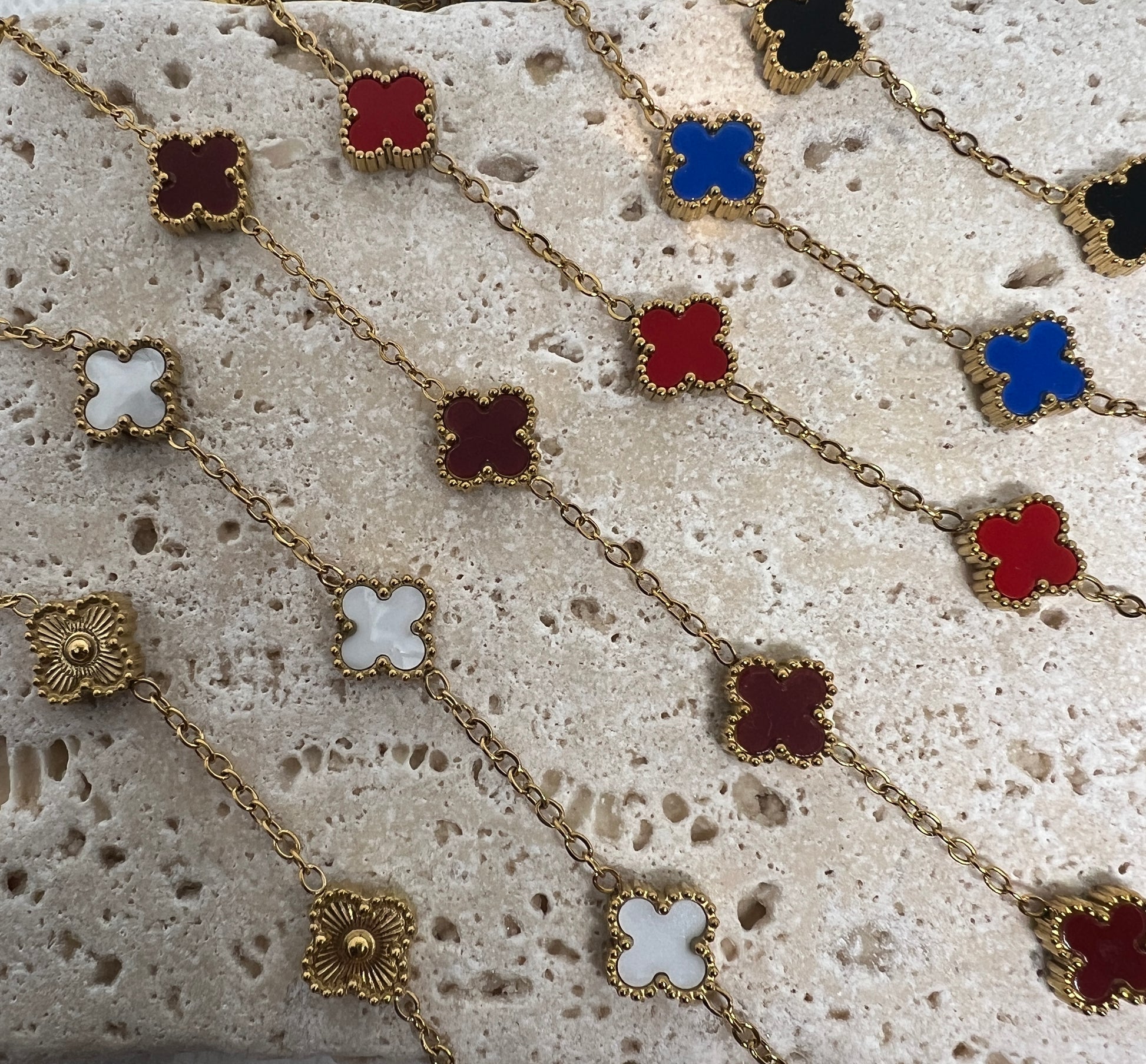 Unsere eleganten Clover-Armbänder sind aus hochwertigem Edelstahl gefertigt, 18K vergoldet und sorgen für einen luxuriösen Look mit langanhaltendem Glanz.